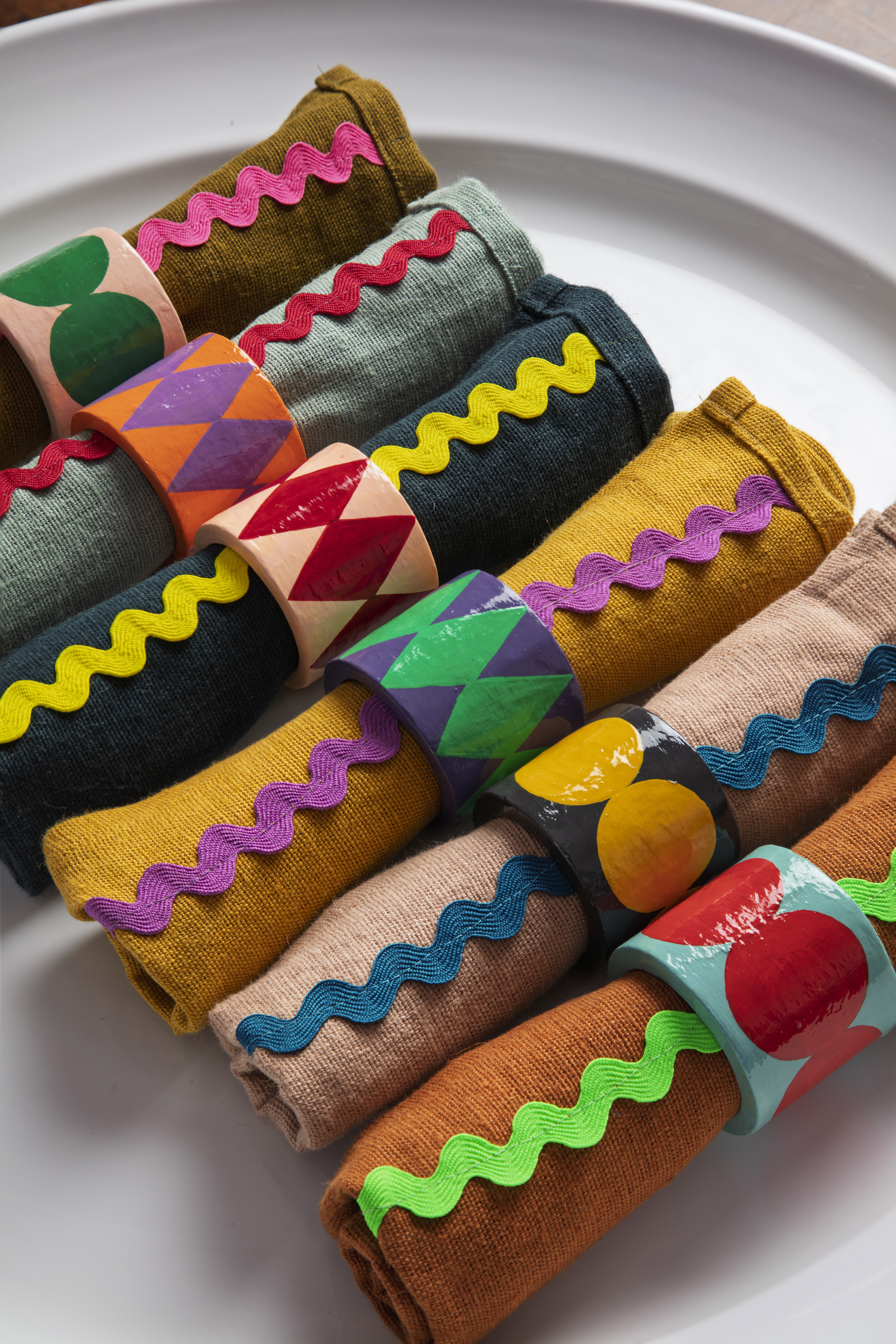 A stunning collection of linen napkins with vibrant ric rac trim along one edge. Designed by RE, the sophisticated colourways look great mixed or matched for a vibrant dining table. 45cm square.