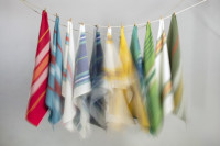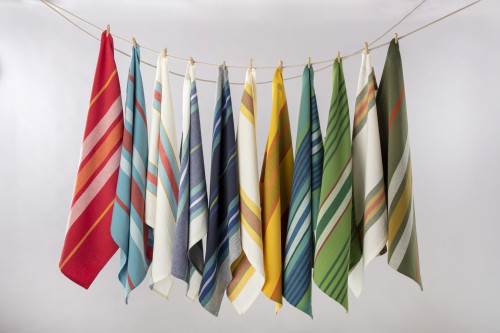 Colourful stripy tea towels made from 100% recycled cotton in a kaleidoscope of co-ordinating stripes.