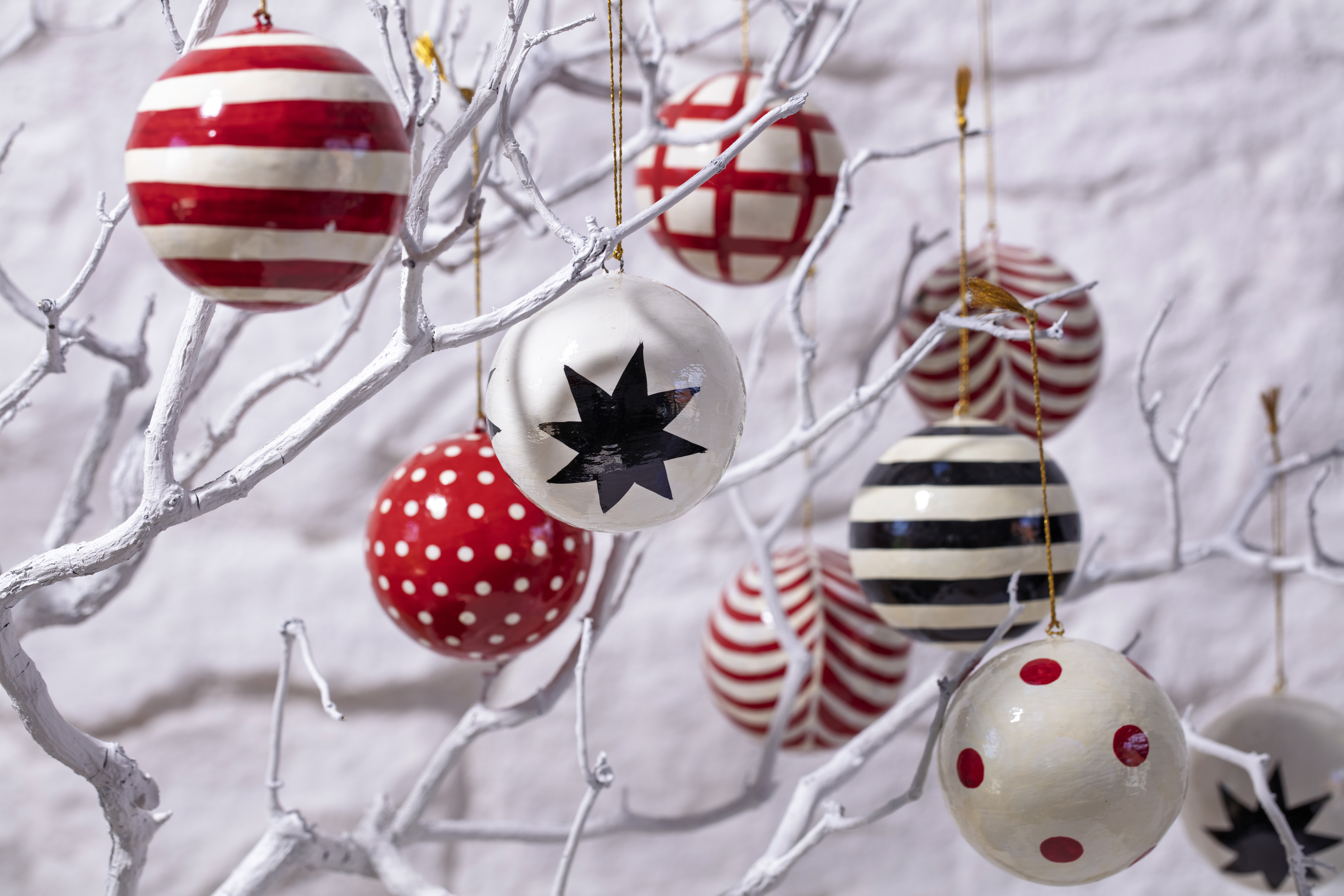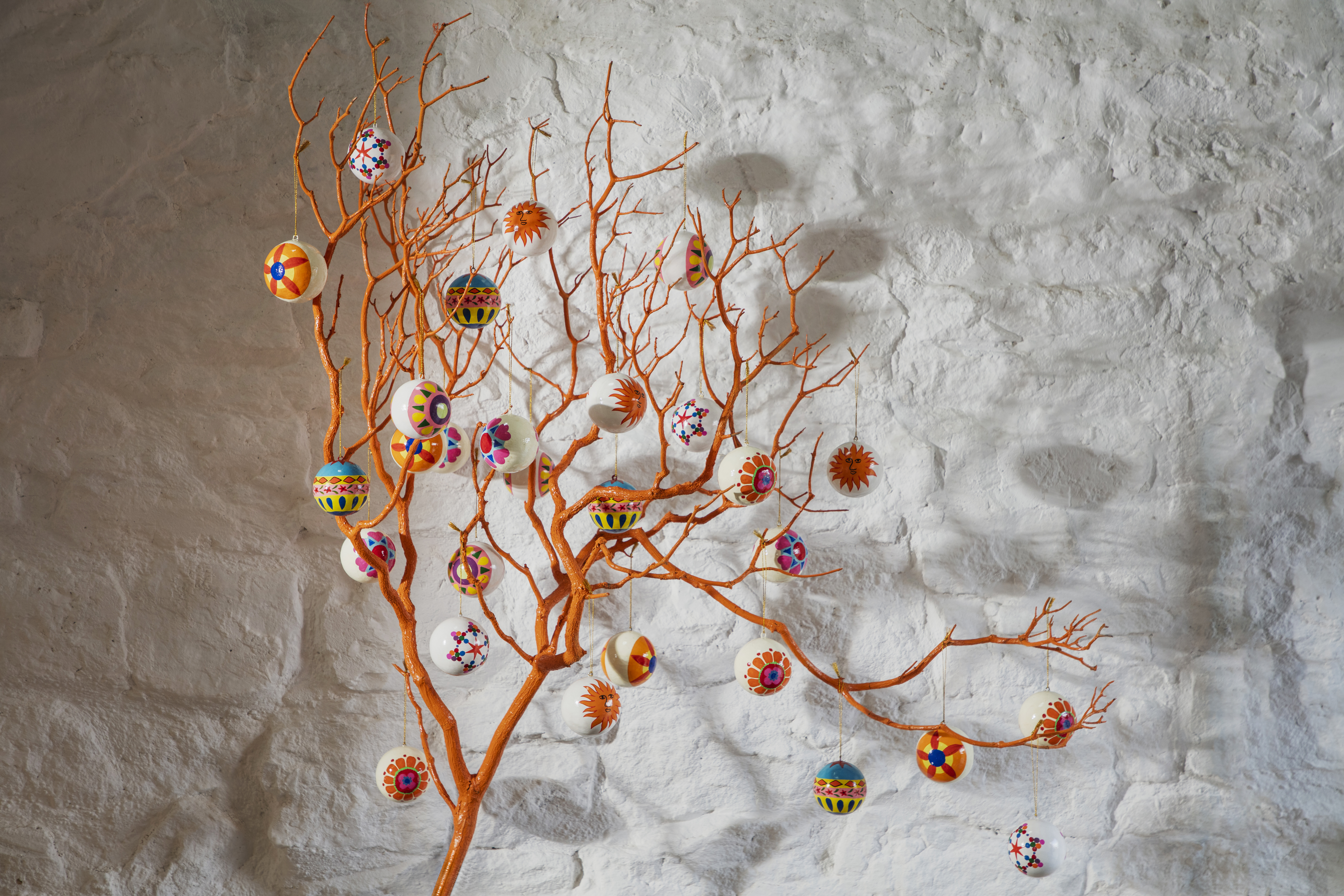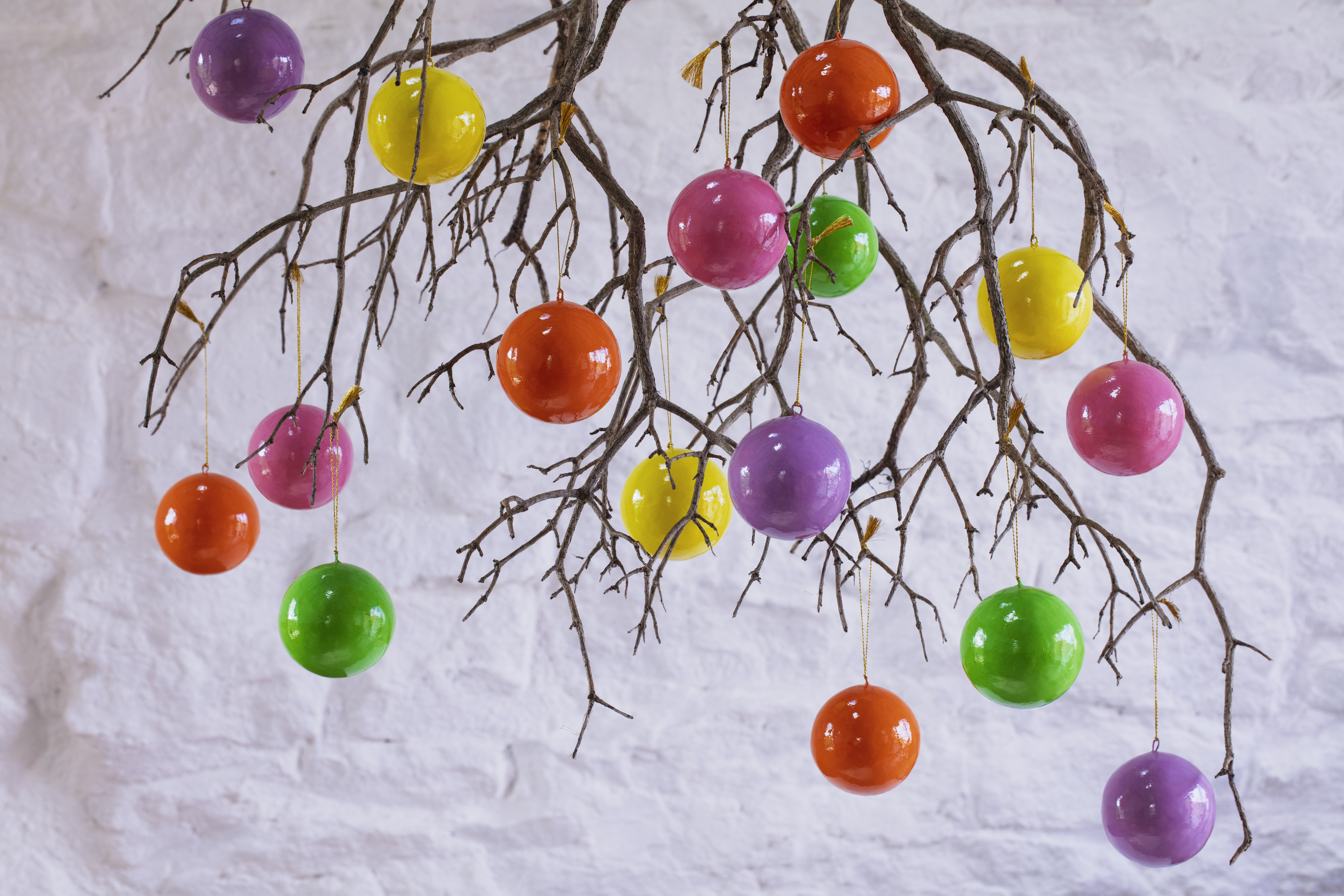 100% papier mache decorations, handpainted in a kaleidoscope of colourful designs, choose from bold graphics, folkart, kaleidoscopic or colourful plains - each one is unique. D7cm