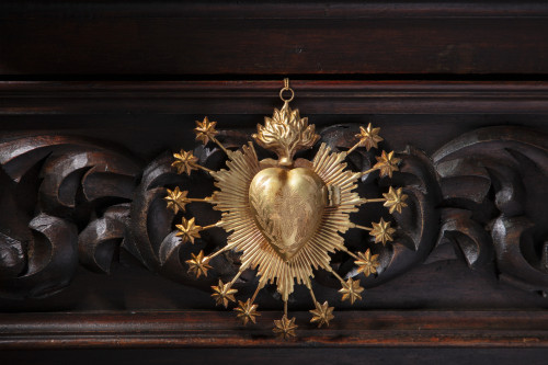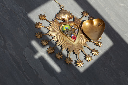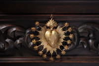 Ornate golden milagro to hang or mount on the wall. The heart opens to reveal a small space to hide your secret treasures... H17cm See product story below for more information...