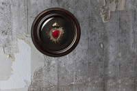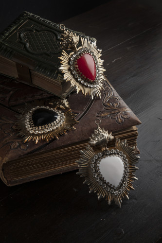 Beautiful 'antique' milagro to hang or mount on the wall. The central heart, in a choice of colours, is surrounded by embossed metal rays. Also shown in our large domed wooden frame. H13.5cm See product story below for more information...