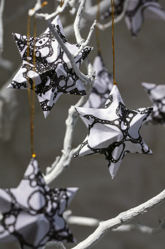 Striking, Fairtrade 3D star handcrafted from black and white marbled cotton paper.