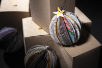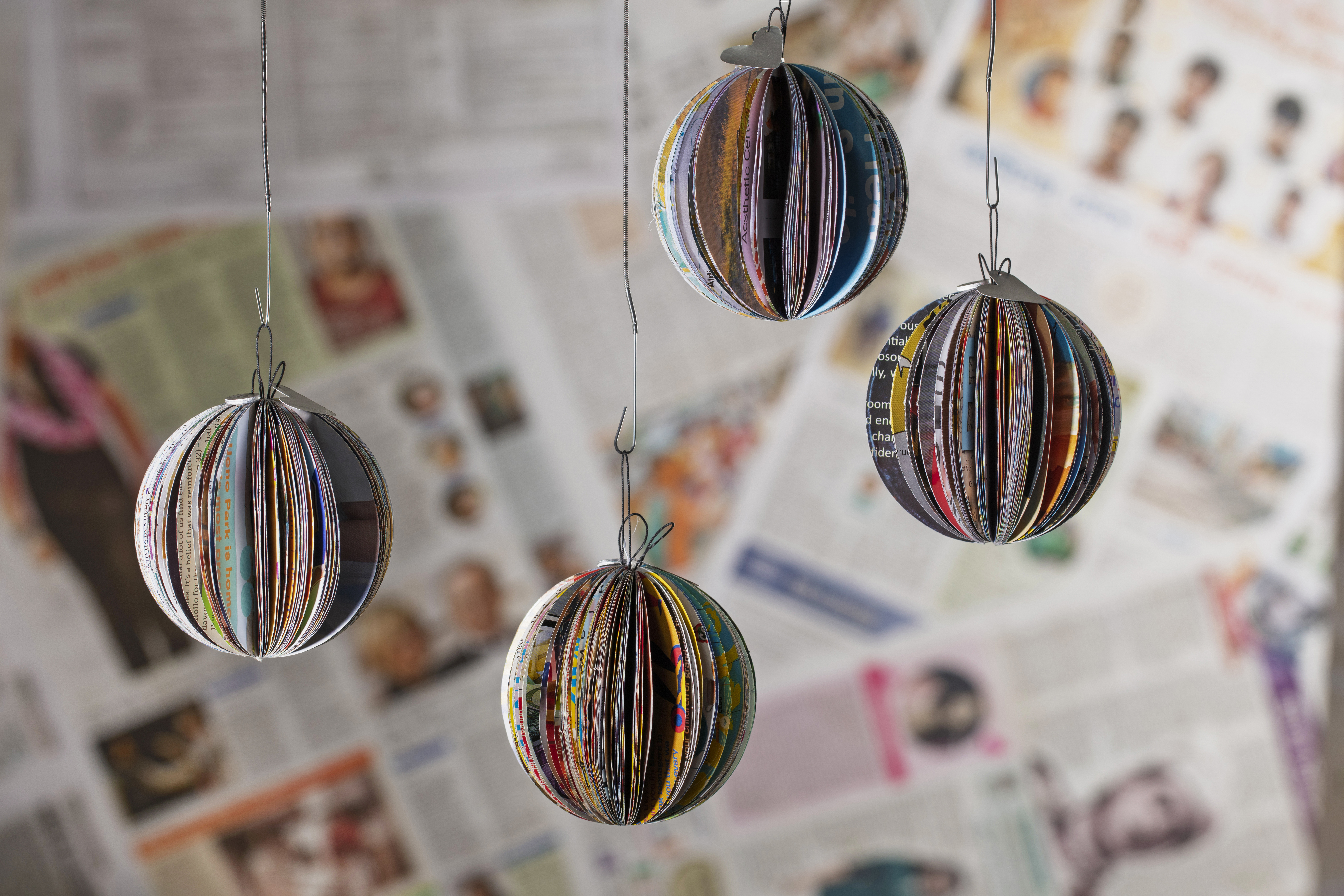 Read all about it! Boxed hanging ball decoration made from recycled newsprint and magazines.
