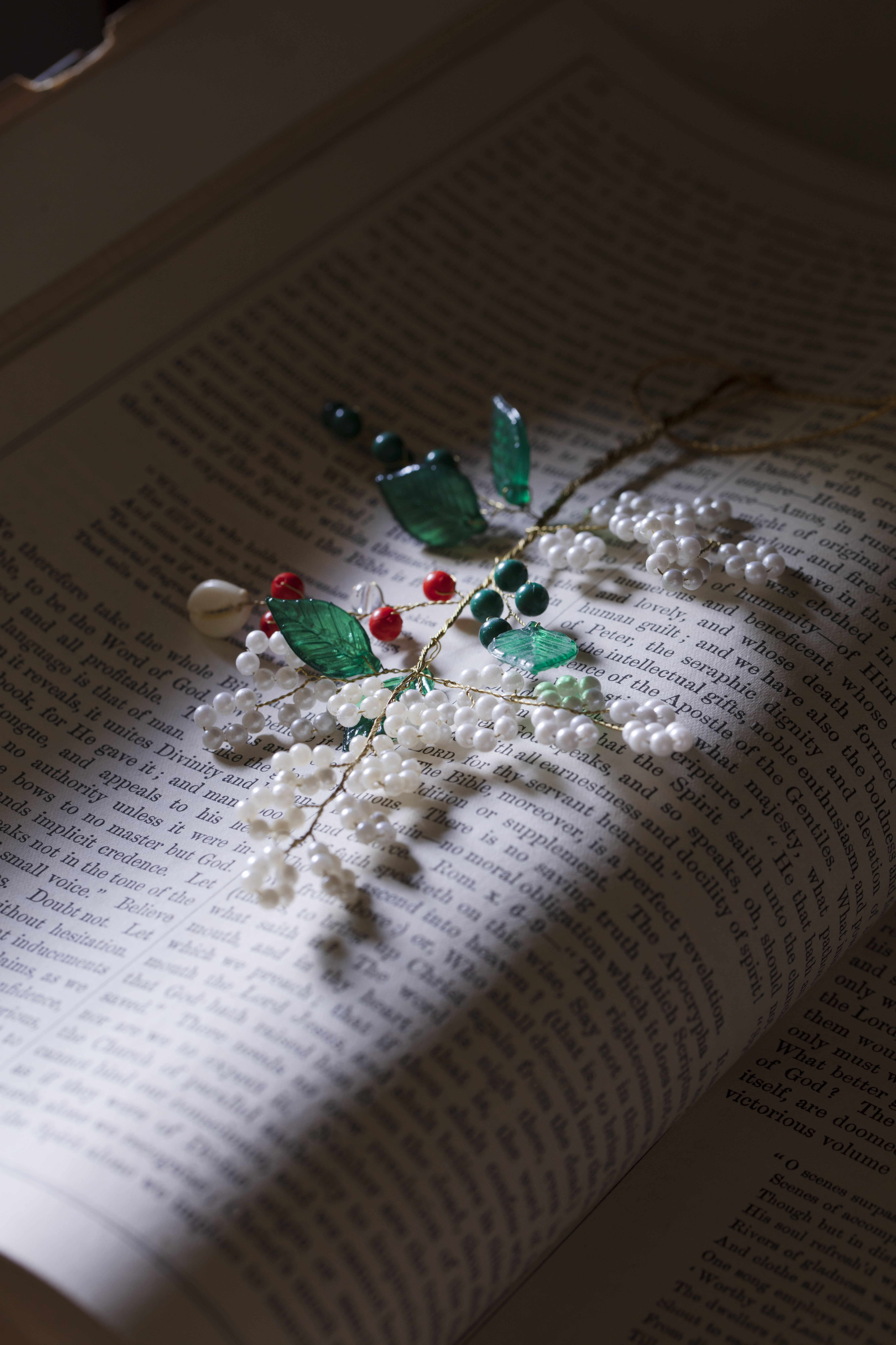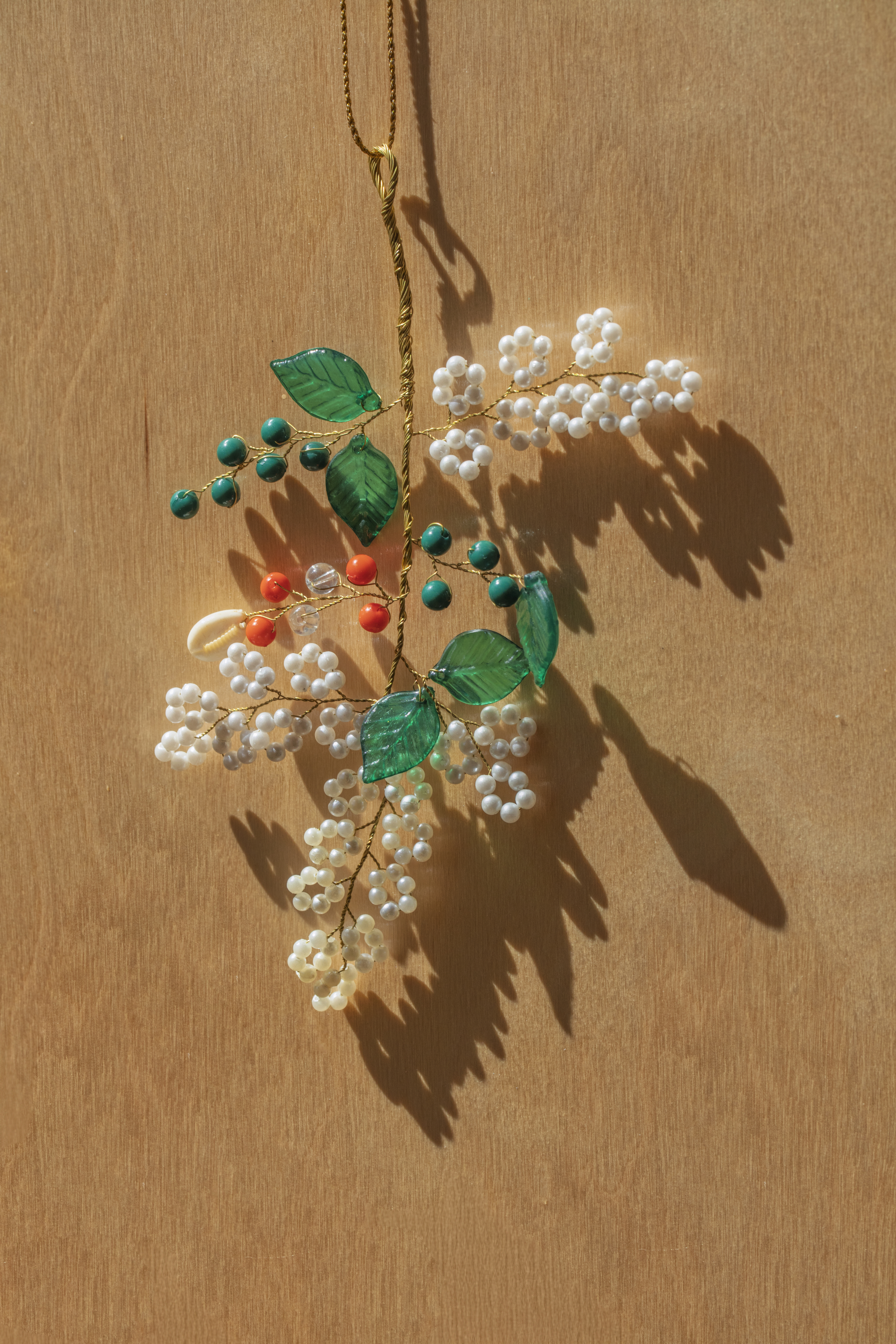 Delicate, handmade wire, coral and pearl beaded bunch.