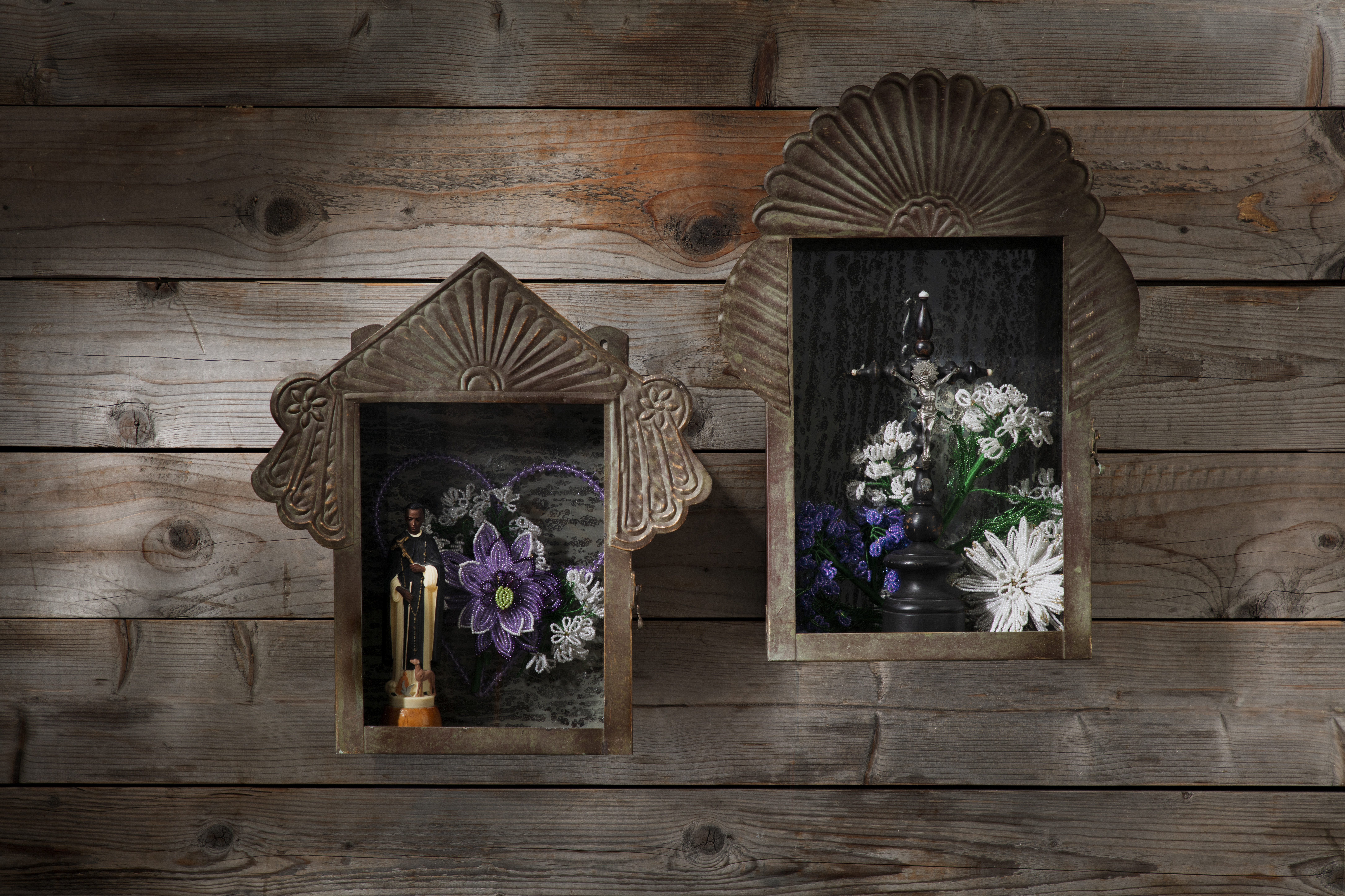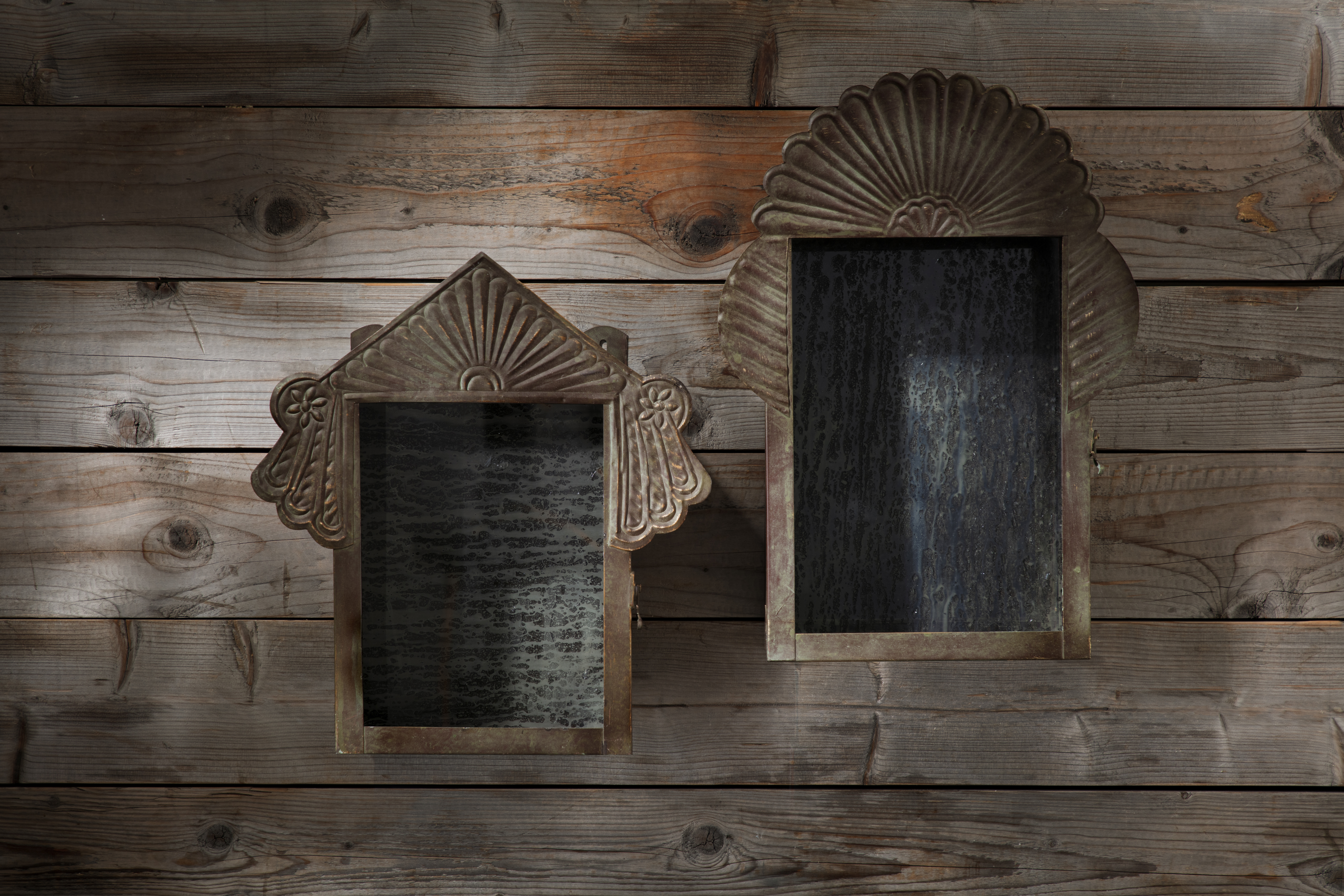 Pressed metal with opening glass door and distressed mirrored backdrop.