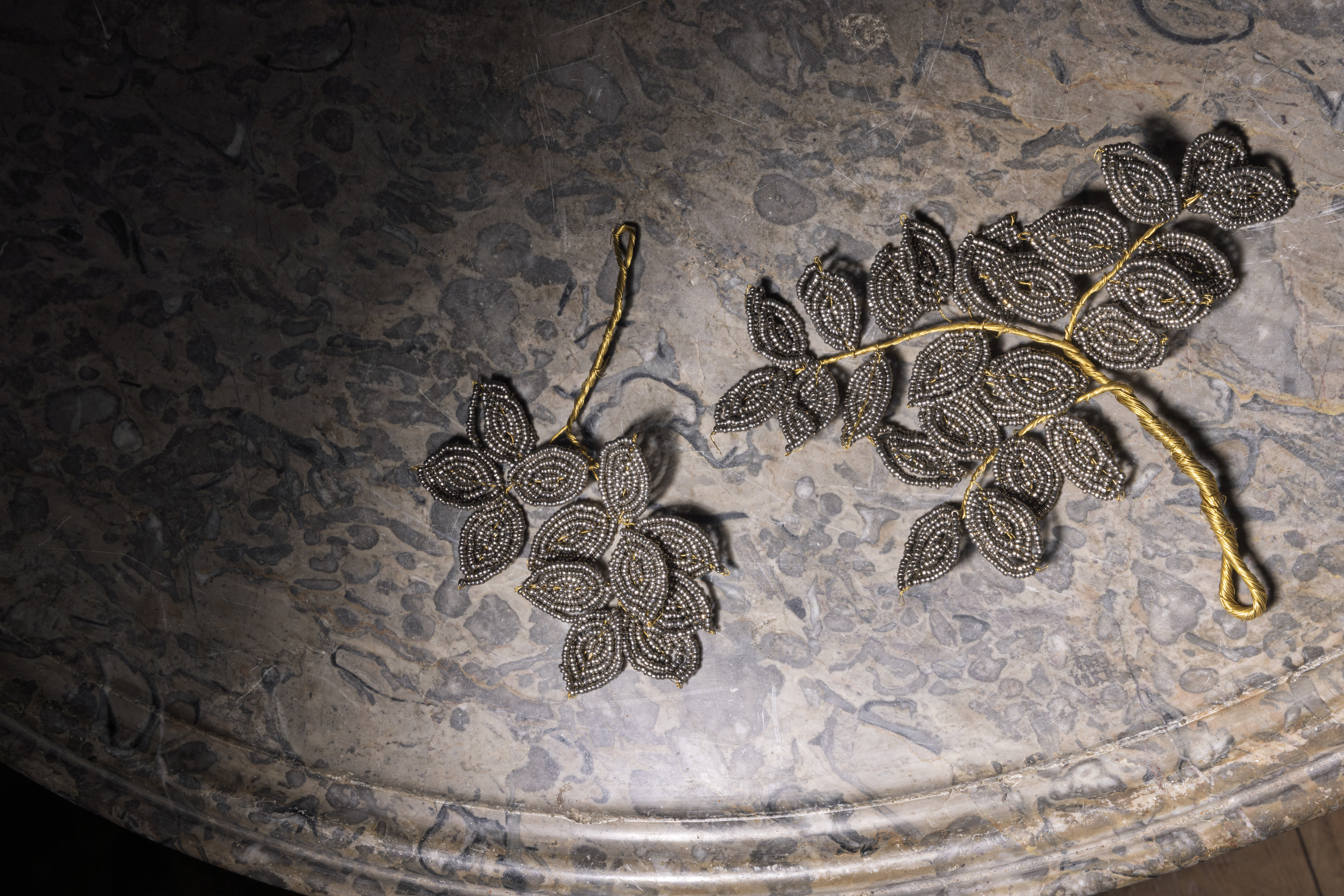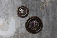 Beautiful 'antique' gunmetal glass beadwork hanging bunches. Also shown in our large domed wooden frame with a selection of purple beaded flowers. Large H22cm Small H16cm See product story below for more information...