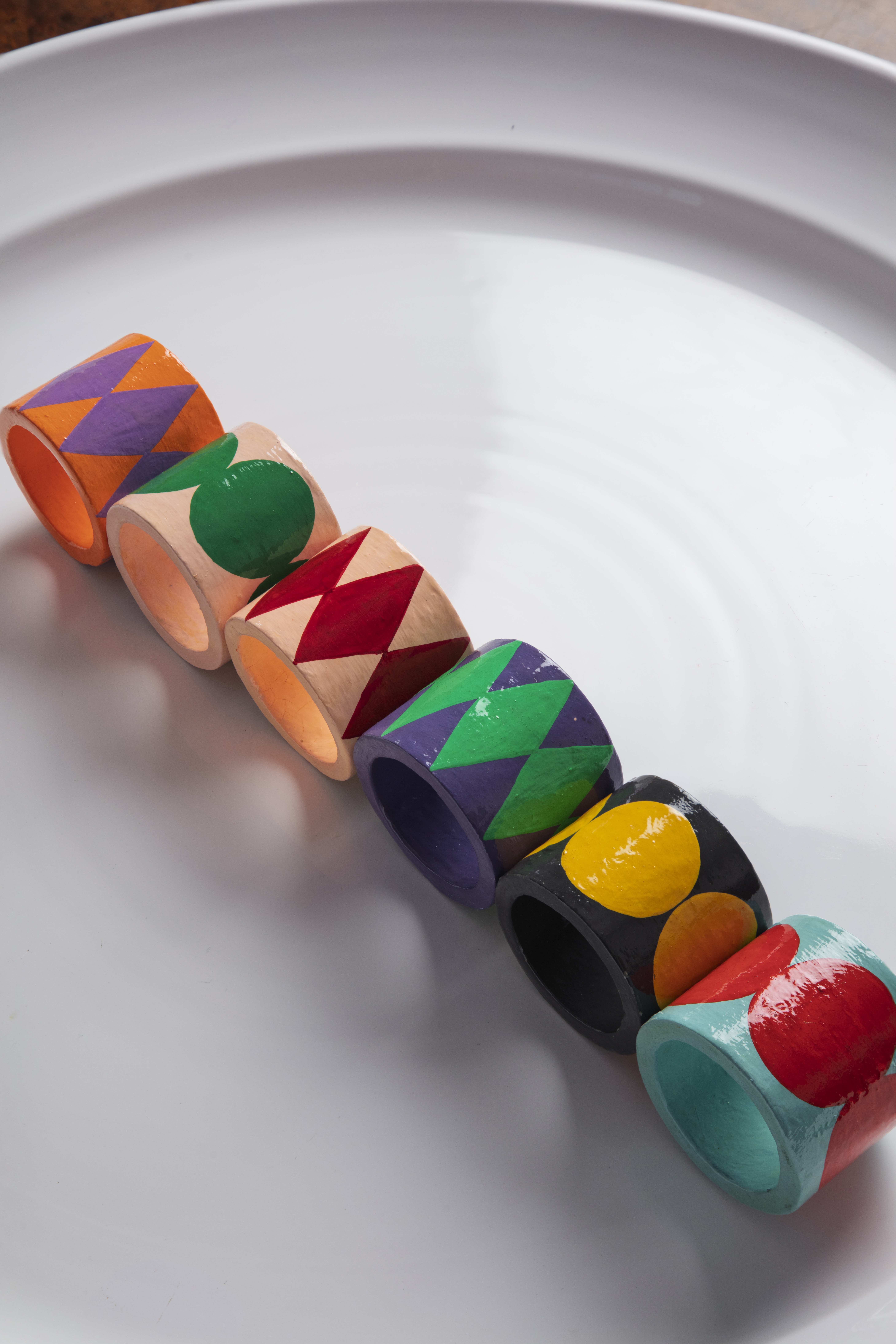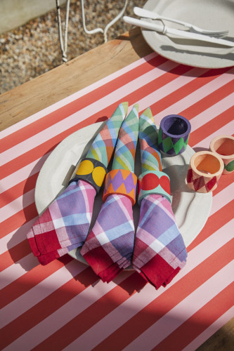 Papier mache napkin rings, handpainted in a kaleidoscope of colourful designs for you to mix and match - each one is unique. Shown with our linen ric rac and cotton check napkins. D5cm
