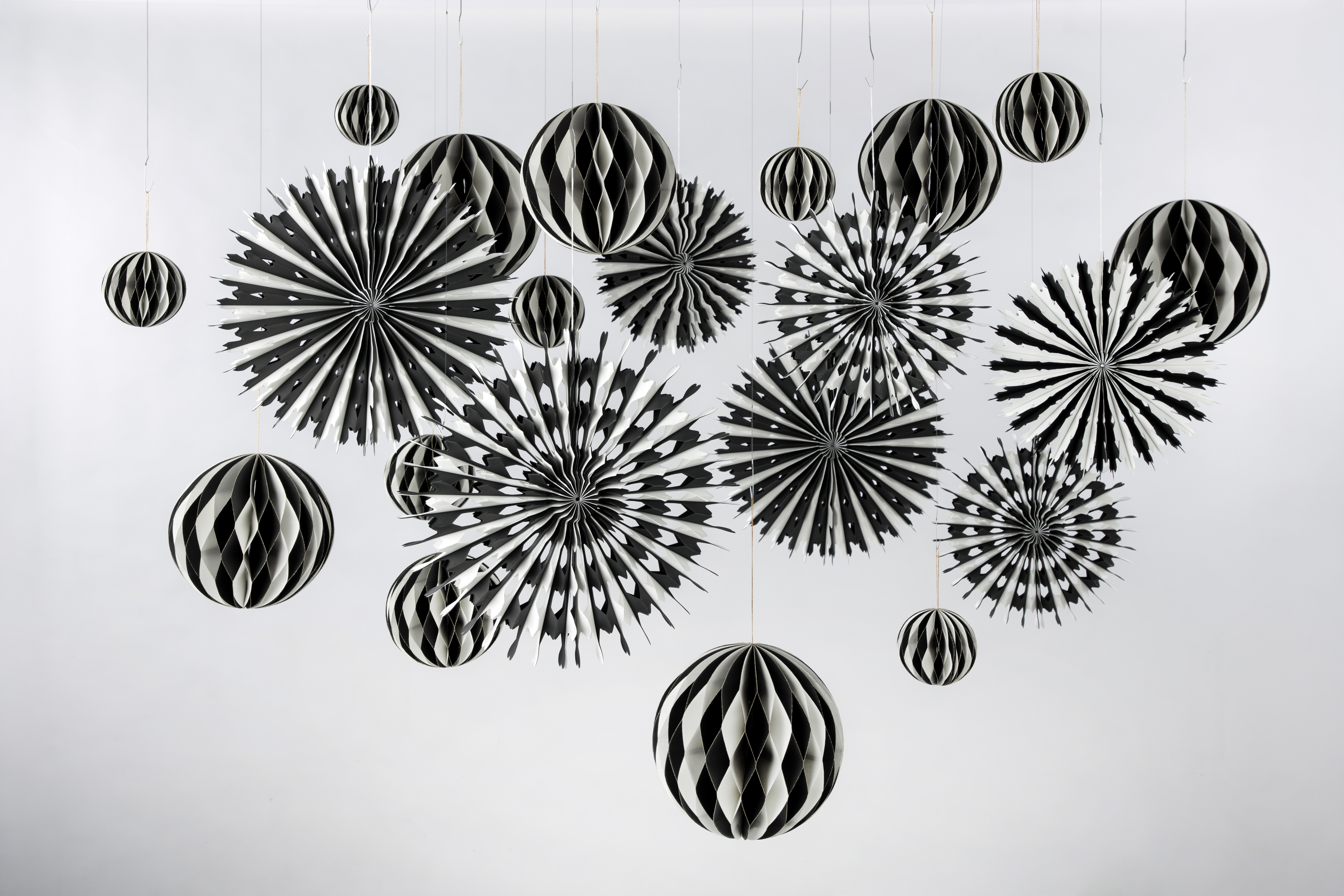 Robust, hanging black & white cardboard decorations for your monotone Christmas.