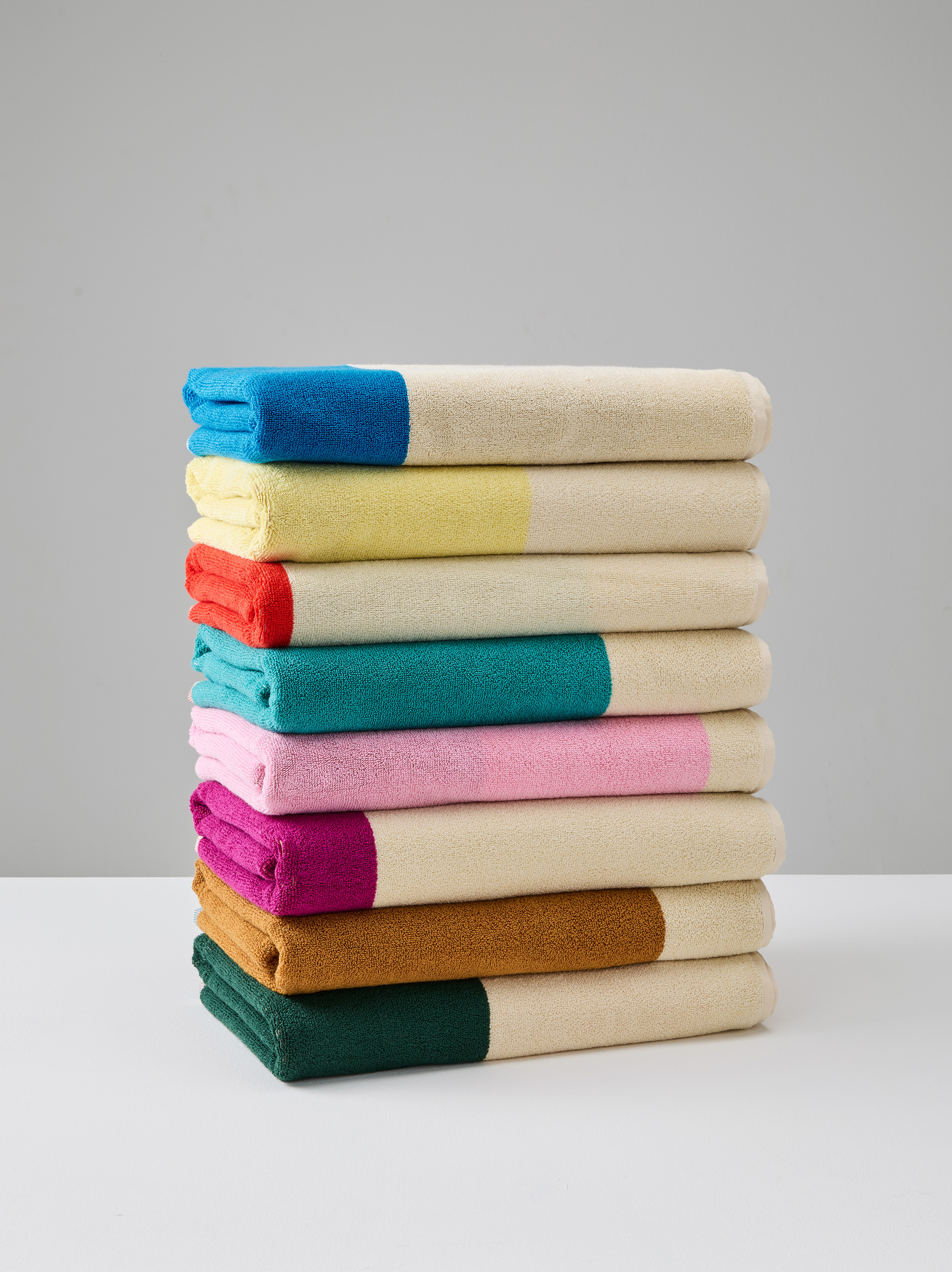Luxurious deep pile 100% organic cotton bath mat and towels in three sizes. Double sided with contrasting woven stripes in two colours. Bath Towel 140 x 70cm Hand Towel 100 x 50cm Guest Towel 50 x 30cm Bath Mat 80 x 50cm