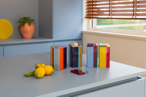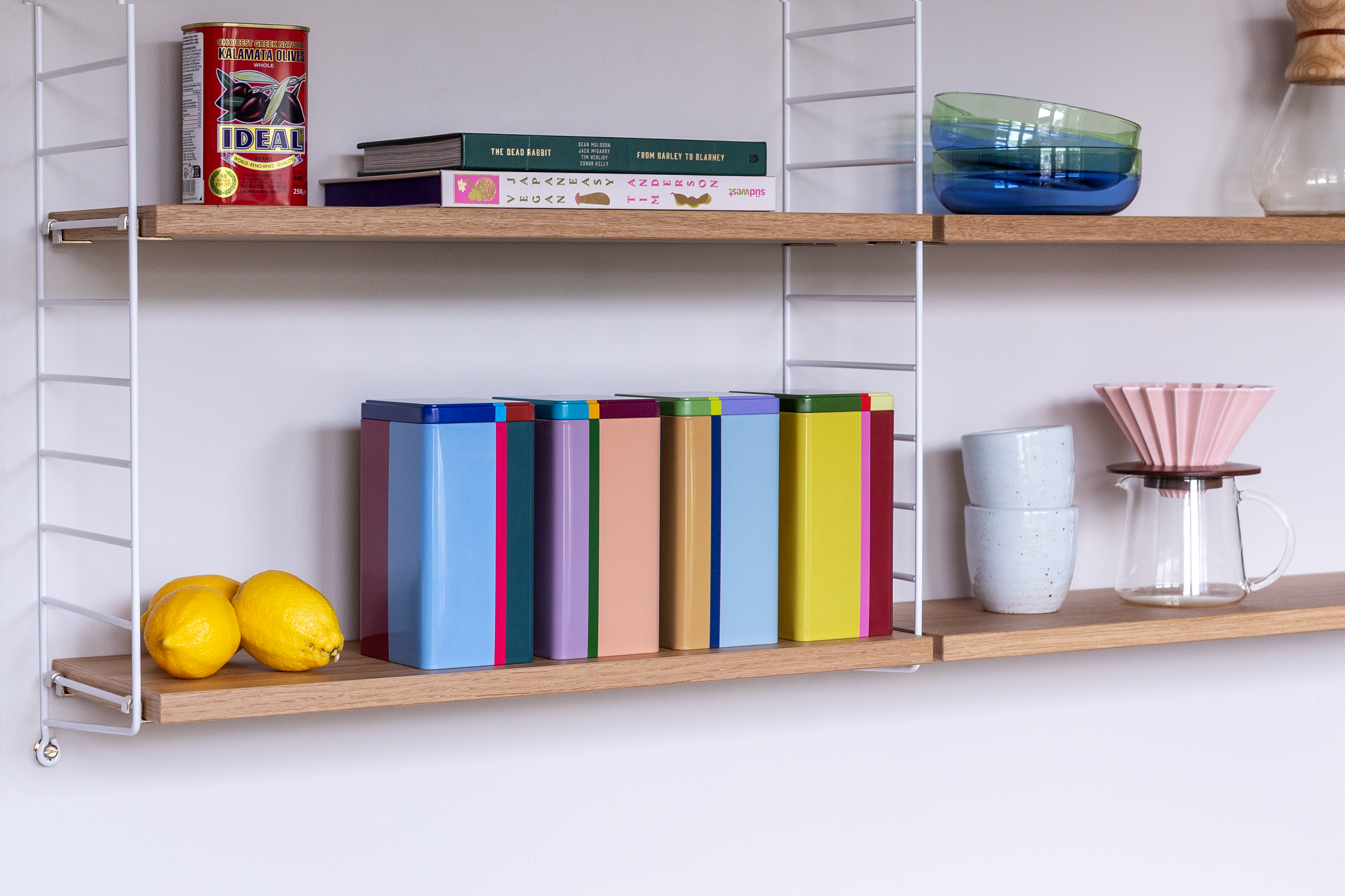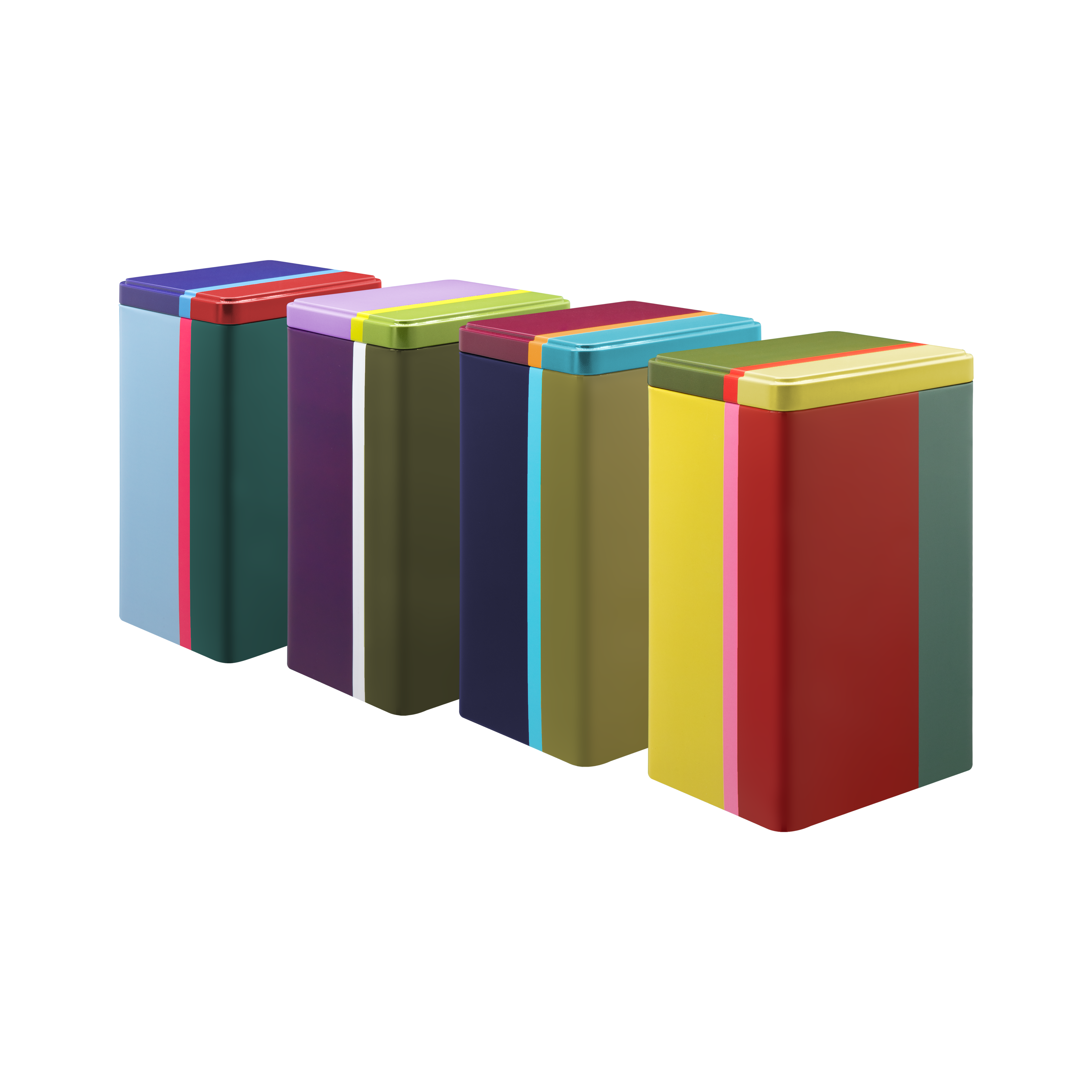 Brighten up your shelves in the kitchen or office with colourful stripy storage tins. Designs vary. H17 x W10.5 x D8cm