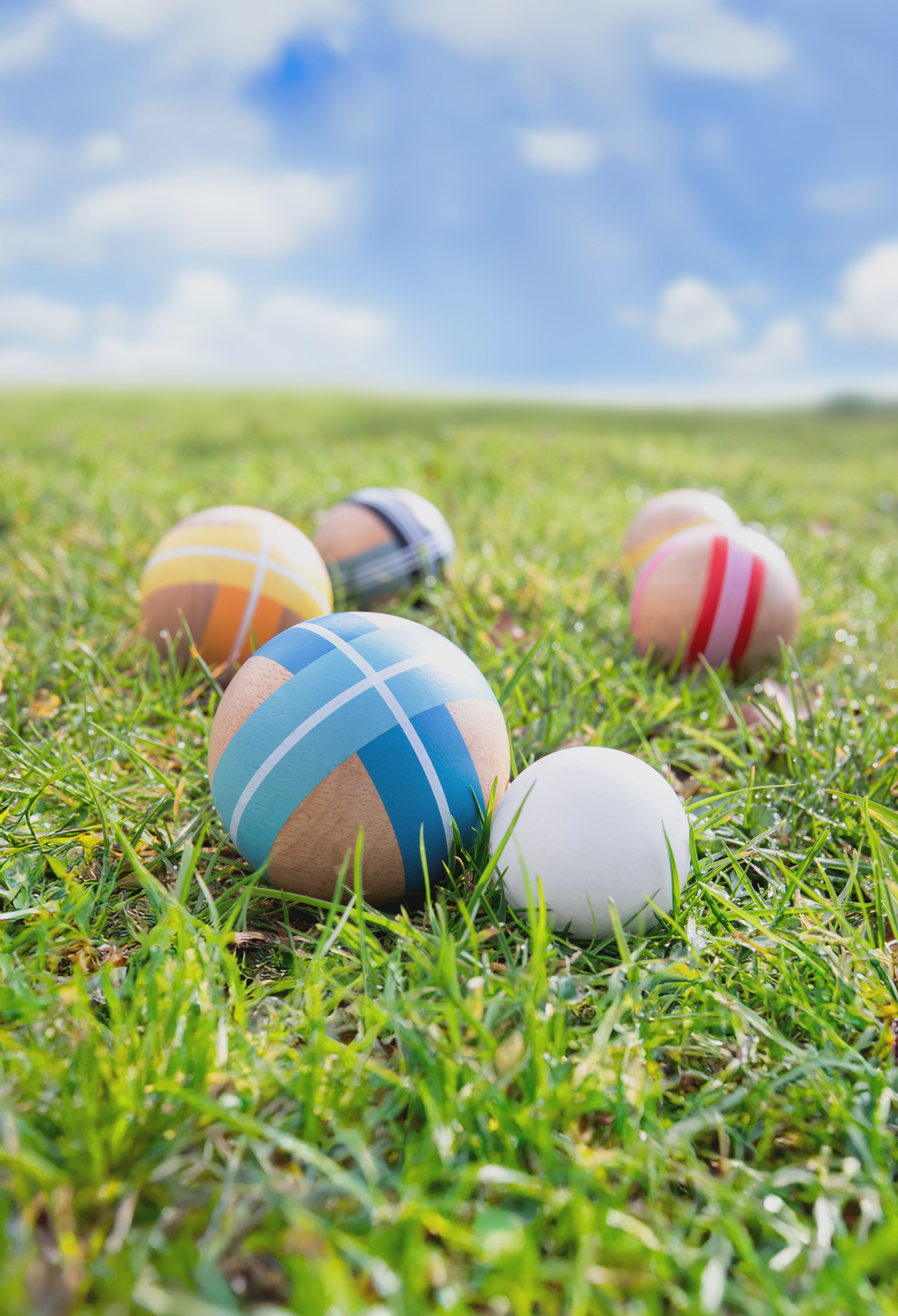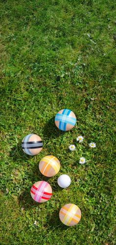 Boxed set of 8 colour coded painted wooden balls and a puck.